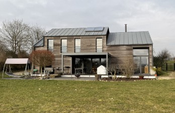 Imaginée en 2009 par larchitecte Matthieu Delatte et réalisée par La Maison de Demain (Belgique), cette maison à ossature bois à larchitecture résolument originale sintègre parfaitement dans un environnement naturel exceptionnel. Façade ultra discrète, toit végétalisé. À larrière, tout souvre : lumière plein sud, grandes baies vitrées et vue dégagée sur le Mont Dieu, et toute la zone classé Natura 2000.Sur 51 ares, longée par un ruisseau, à deux pas de la voie verte Trans-Ardennes et du Canal des Ardennes. Un paradis pour les amoureux de nature, calme et vélo. Superbe pièce de vie ouverte de 50 m², baignée de lumière, avec poêle à bois. Cuisine équipée (plan de travail en marbre). Suite parentale de plain-pied avec dressing, salle de douche et accès direct au jardin. Buanderie, WC. À létage : 3 chambres, 1 bureau , Salle de bains, WC. Extérieurs & annexes. Grande terrasse de 100 m²Pergola bioclimatique RENSON (2019) avec screens et parois vitrées coulissantes. Garage double avec porte motorisée. Cave à vin. Grand local de rangement (vélos, bois